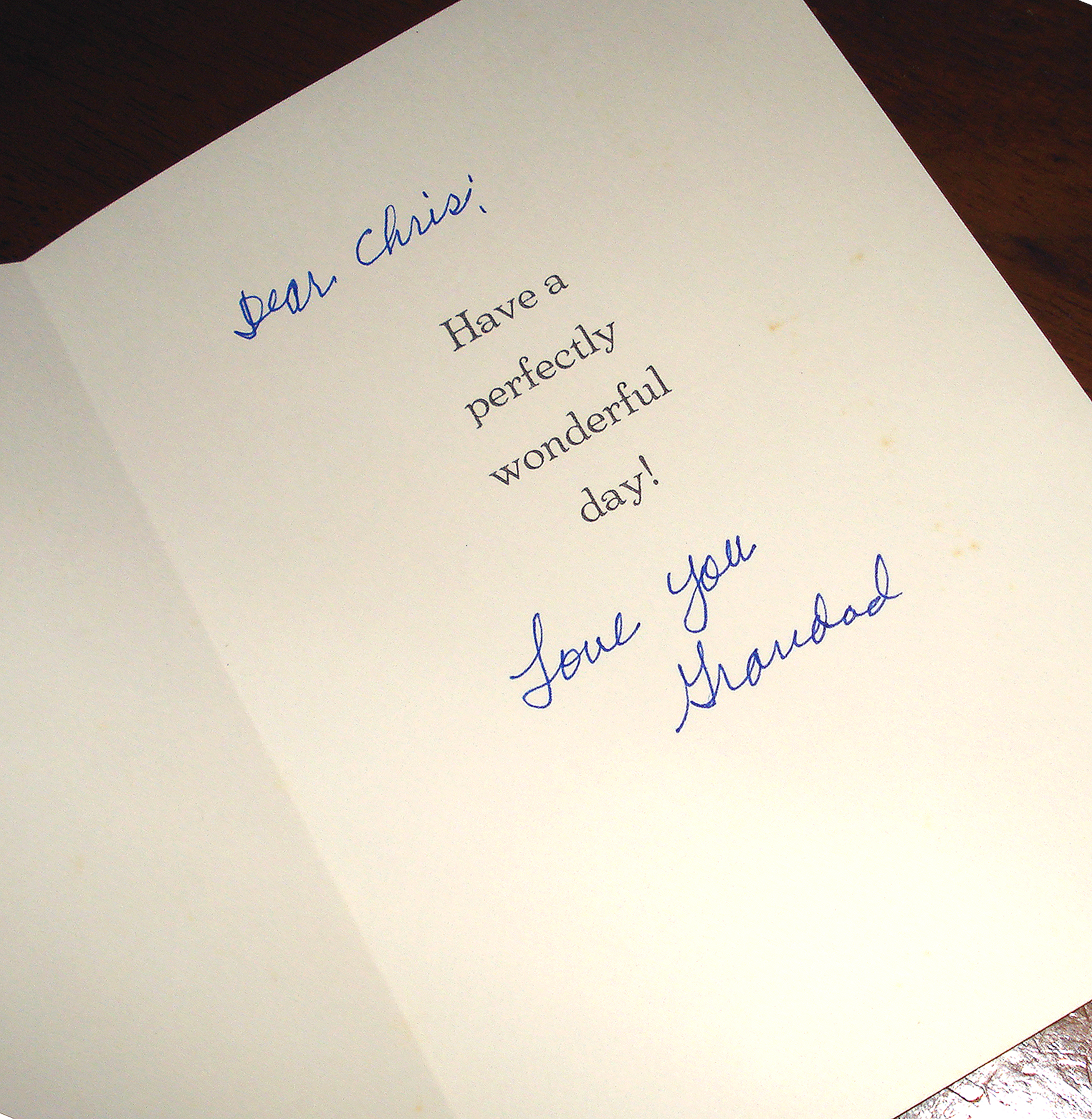 About a week ago something great happened to me. I was in a funk and feeling particularly blah. Normally I would not resort to cleaning my office, but this time – I did. As I was sorting through papers and throwing things out, I came across the card pictured above. It has been several years since my Grandad passed. He and I had a distinct connection, and I could swear sometimes he is right in the room with me.